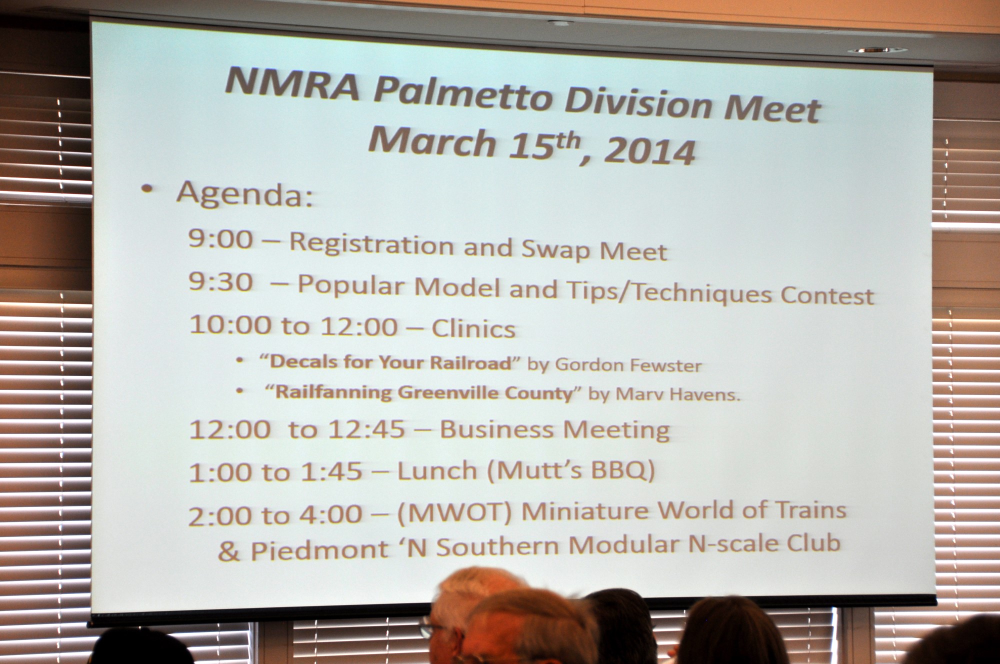 The Palmetto Division held its spring meeting on March 15 with 46 members and visitors in attendance.  The meeting consisted of a swap meet, model contest, Tips & Techniques contest, two clinics, and a business meeting.  Our afternoon activity was a trip to Miniature World of Trains (MWOT) “sneak preview” and the Piedmont ‘N Southern N-scale modular club layout which was also on display at MWOT, located in downtown Greenville.